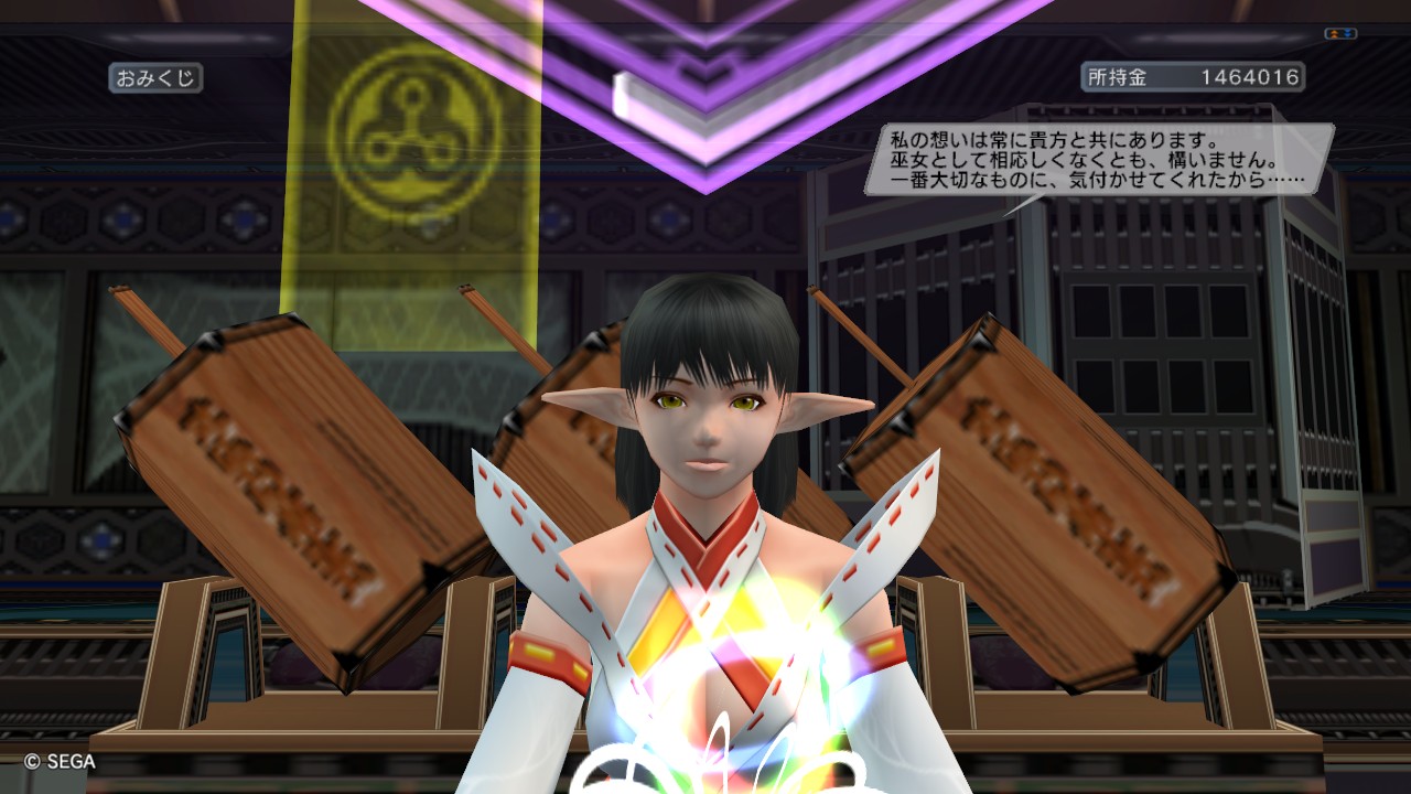 巫女デレてきた!(*´∀`*)ウフフ Category:Mahiro Date:2010年02月02日 やっふ~ぃ(-ω-)/麻尋だよ。 オウトク山のてっぺんにいる、おみくじの巫女さん。 なかなか超星霊や大星霊をくれなかったので、イベント中に仕入れた武器などを 奉納しまくって・・・、ん?貢いでたわけじゃないよ?あくまで「納奉」だよ。 そしたら少し心を開いてくれました。 デレてきたね!ヽ(´ー`)ノ 最終段階までいくと噂では超星霊をくれるとか・・・。 まぁ噂だからアレだけどw でも、ここまできたら最終系までちまちまやっていこうかなぁ~って思います。 んじゃ~~っと、今回はここまで (* ^ー゚)ノバイバイ